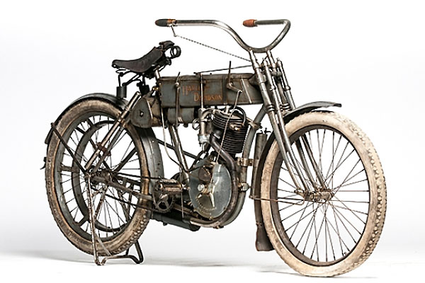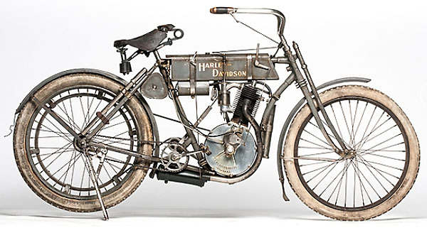 Sold for $650,000 on March 21, 2015 The three Davidson brothers, plus William Harley, weren’t bicycle racing champs or trained engineers like their competitors in the pioneering days of motorcycling. But they knew a good idea when they saw it, and set about building a motorcycle in 1901, which they finished in 1903, a single-cylinder of 116cc. This first prototype lacked power, so they enlarged the engine size to 24.74 cu-in. (405cc) for their next model, and with a little advice from Ole Evinrude, the bike would climb hills without ‘light pedal assistance,’ establishing a pattern which served them well for the next century – build it stronger, and build it bigger. Their second prototype adapted the Merkel purpose-built motorcycle frame rather than their first bicycle frame, and this second machine was finished in 1904, and competed in a race on September 8th of that year in Milwaukee – the first recorded appearance of a Harley-Davidson. |