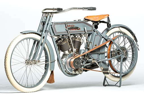Sold for $215,000 on March 21, 2015 The year 1912 was only the second of Harley-Davidson twin-cylinder production, although they had appeared in H-D’s press as early as 1908. There’s no evidence a twin-cylinder machine was actually sold by the factory until the 1911 model 7D, which differed significantly from the 1908 racer and 1909 Models 5-D (a roadster) and 5-F (the racer). H-D claims 27 of the Model 5 machines were built, but they were likely used for promotion or racing only; no mention of a twin-cylinder model appears in H-D parts books until 1911. As well, the 1908-09 twins used 'atmospheric' inlet valves (i.e. activated by piston suction only, with no camshaft or pushrod), which gave erratic performance in any but a full-throttle position, which would not have suited Harley's already established reputation for reliability and strong running. |