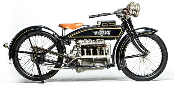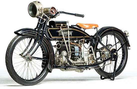 many materials in short supply. The 1917 model range (the Model G), announced in September 1916, had a three-speed gearbox, the ‘short’ frame, a proper kickstarter, stronger forks, and a new induction tract, which fed the cylinders more efficiently, and generated more power. Full electric lighting was offered, and even Henry Ford bought himself a Henderson! The year 1917 was the last of ‘true’ Henderson production, as the company was purchased by Ignaz Schwinn in October of that year, and production was moved from Detroit to Chicago, while the Henderson Motorcycle Company was no more – from then on it was Excelsior-Henderson, a branch of the mighty Schwinn empire. |