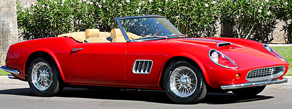 Value of a real Ferrari 250 GT California is about $25,000,000 280 bhp, 2,953 cc single overhead camshaft V-12 engine, three Weber carburettors, four-speed gearbox, independent front suspension via A-arms, coil springs and telescopic shock absorbers, live rear axle with semi-elliptical springs and telescopic shock absorbers, four-wheel hydraulic disc brakes. Wheelbase: 2,400 mm (94.5 in.) One of the Modena Spyder copies from the movie sold atauction for $128,472 in April 2010 |