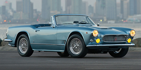 Vignale 3500 GT/GTi Spyders The rarest factory iteration of the 3500 GT was the spyder, which was bodied by Alfredo Vignale on a slightly shortened 100-inch wheelbase chassis. The car offered here is an excellent, original, straight, rust-free example of that rarity, and it has been treated to a recent no-expense-spared restoration by a well-known marque specialist in Southern California. The body was refinished in its original color of Argento Luna (Silver Moon), and the interior featured elegant dark blue leather, a comprehensively instrumented dashboard, light grey carpet, and a new black top. |