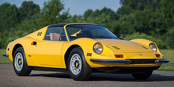 the tradition thereafter, calling all V-6 and V-8 engines Dinos. Naturally, then, a late-'60s line of transverse-engine V-6 sports cars inherited the Dino name, and their immense success meant there were the resources and incentive to develop new models rapidly. In fact, the 2.4-liter Dino 246 GT debuted just six months after the first sales of the Dino 206. The new car strongly resembled the 206, although fitting the new engine required lengthening the chassis, and extending the body by 3.3 inches. That would generally not be noticeable, but a 206 was less than 93 inches long and if anything, the additional length made the Dino even more attractive. Derived from a late-'50s racing engine design by Vittorio Jano, the 2,419.2cc V-6 was every cubic inch an exotic Ferrari engine. It’s a profoundly oversquare dry-sump design with dual overhead cams, four main bearings and triple Weber 40 carburetors. As both the specifications and Ferrari lineage suggest, it’s a screamer, making its 195 HP at 7,500 RPM, with a glorious noise from the quad tailpipes that is unique, unforgettable and thoroughly Ferrari. Backing up the engine is the five-speed transaxle from the 206, with a single dry disc clutch. Suspension is all-independent with double wishbones front and rear, four-wheel disc brakes and rack and pinion steering. In short, in a car from 40 years ago, everything you could ask of a sports car today, although it’s hard to imagine any modern car weighing only 2,381 pounds. If the 206 GT and 246 GT are difficult to tell apart at a glance, that’s not the case with the GTS. Built solely for America from 1972-1974, the GTS replaced the GT’s small rear sail panel windows with triple louvres, and of course, the top comes off. Great care is evident in this car’s history, as it has retained not only its original Cromodora alloy wheels, but the numbers-matching engine and factory 5-speed transmission, as well. The Giallo Fly Yellow exterior is correct; as are the optional Daytona leather “chairs,” and air conditioning, power windows and even original factory manuals. |