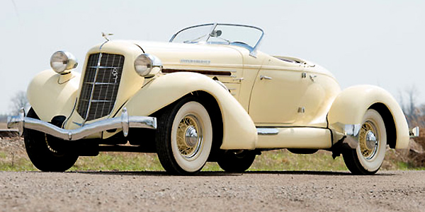 Sold for: $423,500 on August 31, 2014 As with many Classic Era manufacturers, Auburn Automobile Company produced its finest automobiles during its last years of existence. Great things came out of dire straits, in this case the final Alan Leamy-designed model of 1934, in which the company had invested heavily. The model sold better than the 1933s, but was nonetheless a sales failure, and was halted after just a few short months of production. Designer Gordon Buehrig was called upon to give the 1934 design a fresh, saleable new look, on a shoestring budget. Buehrig focused on the front end of the Auburn design, giving it a new grille, hood line, and headlights. Copying the famous Duesenberg SJ, Auburn’s “big brother,” a Schwitzer-Cummins centrifugal supercharger was to be made available on the top-of-the-line 280-cid, 150-hp inline eight-cylinder Auburns for 1935, complete with the iconic external exhaust, the calling card of supercharged Cord Corporation products. Supercharged models came standard with the trusted, durable Columbia two-speed “Dual Ratio” rear axle, which provided both low gearing for fast acceleration and a higher final drive ratio for improved top-end speed. The final trick Buehrig pulled out of his hat was a dramatic new body style that would stimulate traffic into Auburn showrooms. Recalling the famous Leamy-designed speedsters of 1931-34, and, more pointedly, recognizing that fifty of those bodies remained unused in storage, Auburn’s Harold Ames designed a new speedster that would be just the thing. Buehrig based his design on a Duesenberg speedster he had created for Weymann of Indianapolis. The first fifty speedsters produced in 1935 would utilize the top, doors, windshield, and cowl of the leftover bodies, but with a new tail and modifications around the firewall to blend with the new 1935 front end. To modernize and further streamline the design, Buehrig added flowing, aggressive pontoon-style fenders. The bodies were extensively reworked and reshaped to the new Buehrig design, and then mounted to chassis at the Auburn factory in Connersville, Indiana. After these bodies ran out, with demand for speedsters still intact, a number of all-new bodies were produced during the remainder of the 1935-36 run.